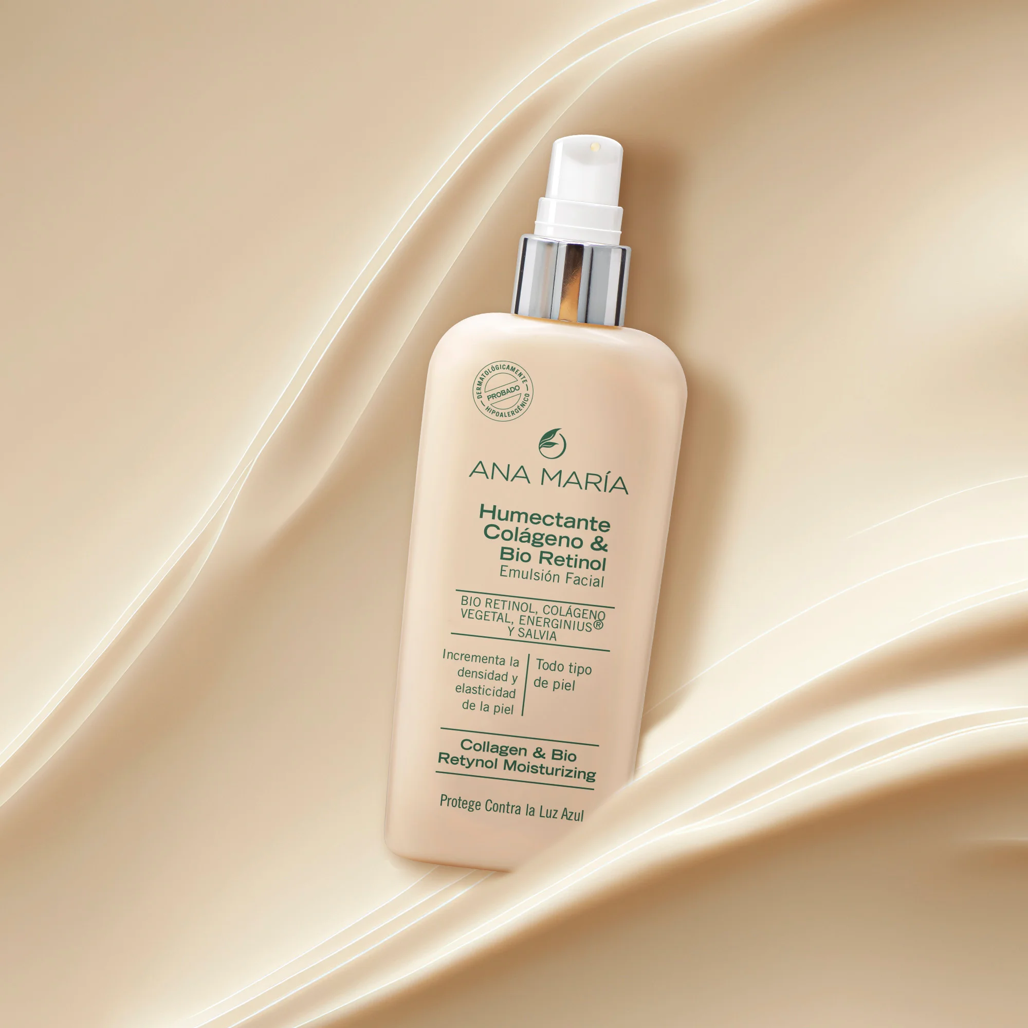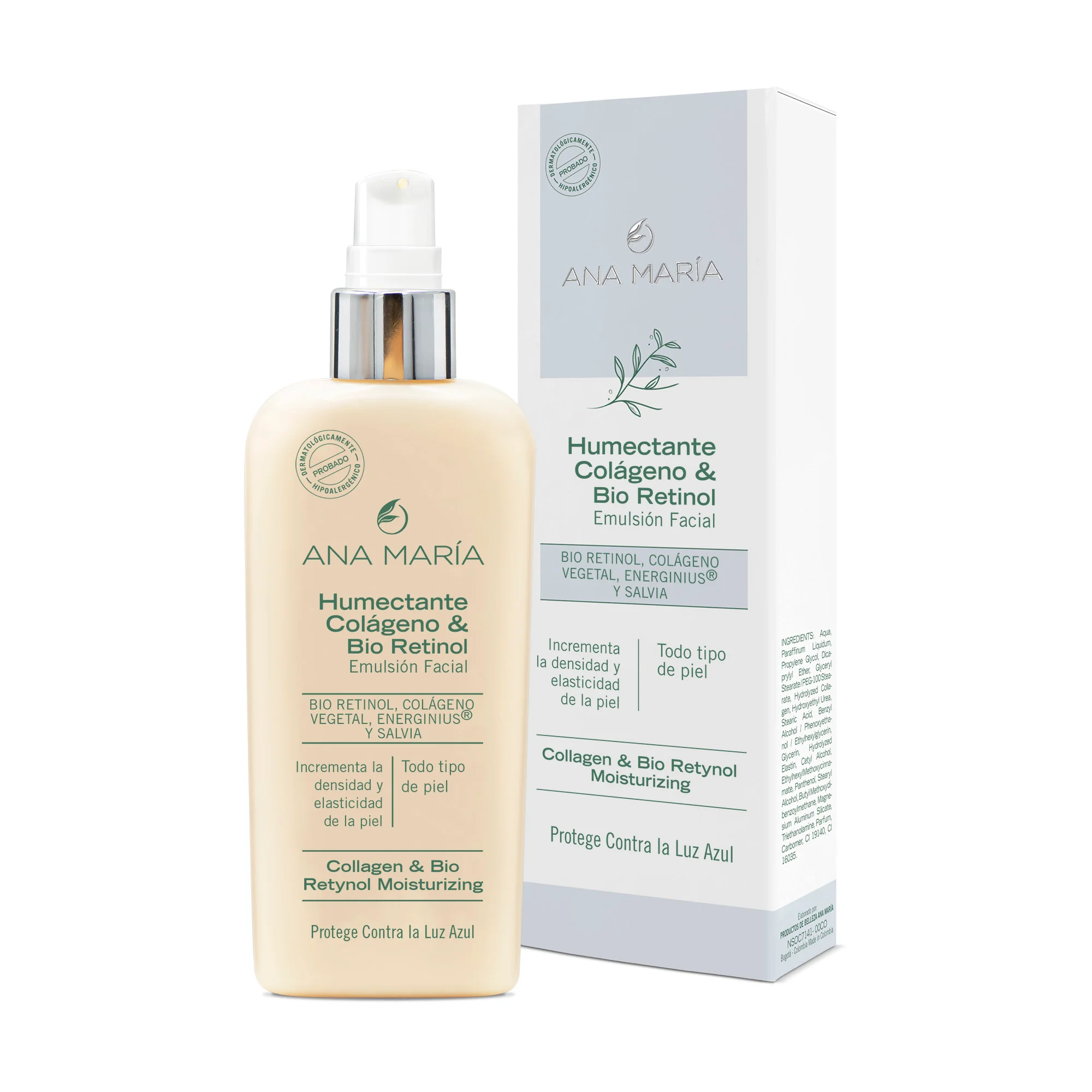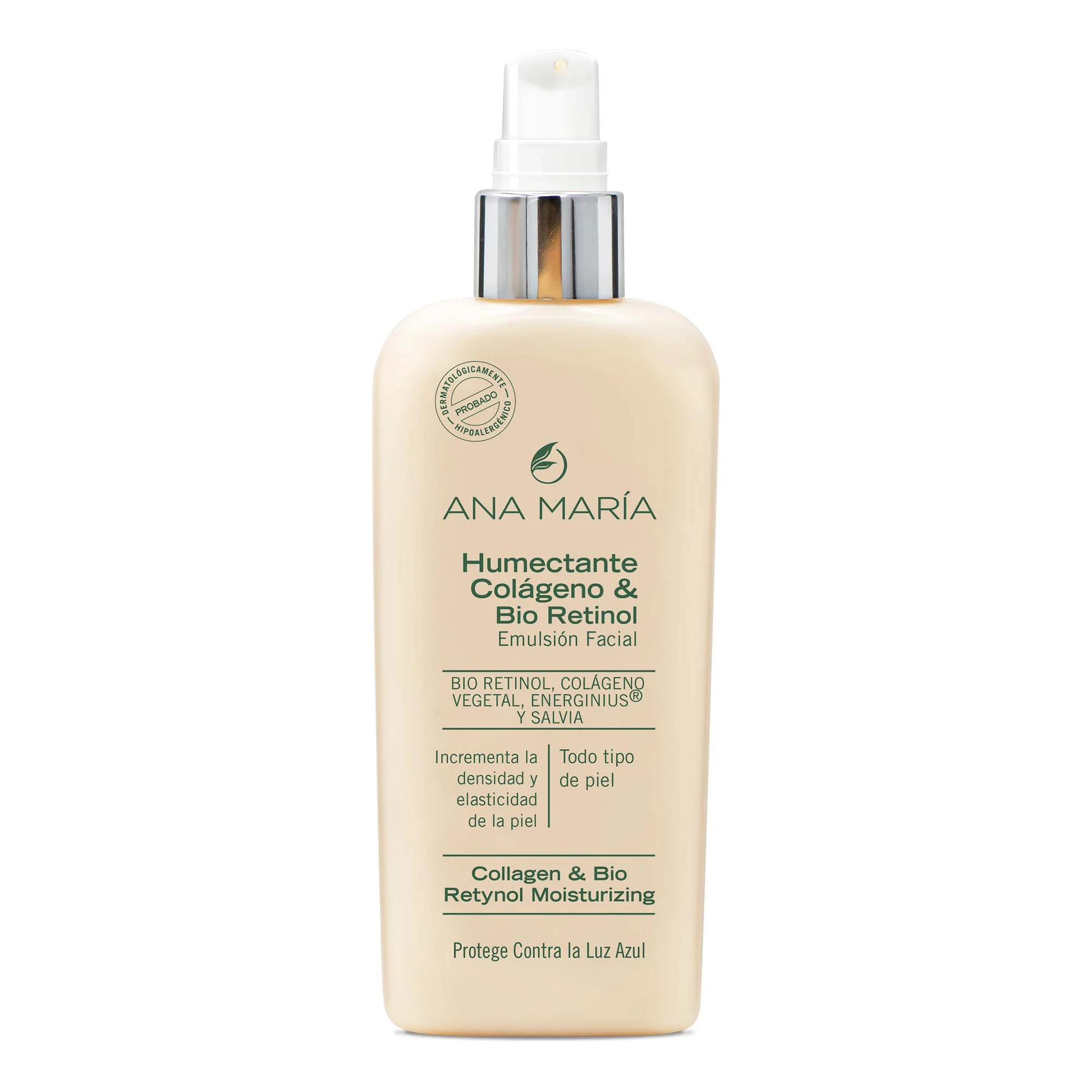 Crema Hidratante y Humectante de rápida absorción, enriquecida con COLÁGENO VEGETAL, BIO RETINOL, D PANTENOL (Pro Vitamina B5) y SALVIA, que actúa estimulando la producción de colágeno y elastina, incrementando la densidad y la elasticidad de la piel.